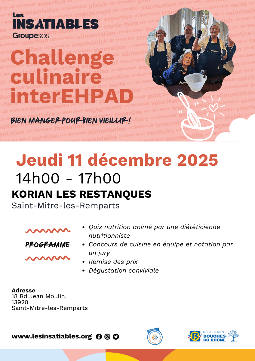 Les Insatiables organisent un challenge culinaire inter-EHPAD, au cours duquel trois résidences autonomie et EHPAD s’affronteront amicalement autour d’une activité culinaire, à l’EHPAD Korian Les Restanques à Saint-Mitre-les-Remparts.