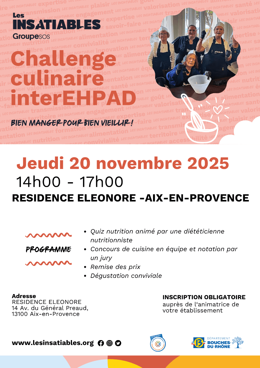 Les Insatiables organisent un challenge culinaire inter-EHPAD, au cours duquel trois résidences autonomie et EHPAD s’affronteront amicalement autour d’une activité culinaire, à la résidence Éléonore, à Aix-en-Provence.
